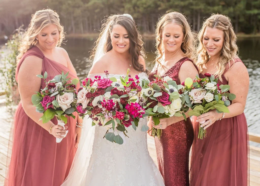 Barbara & Matt’s beautiful November wedding showcases a perfect combination of deep, rich colors balanced with soft neutral tones. While burgundy tones are common for fall weddings, adding the pops of magenta and dark-centered anemones gave the designs an elevated and signature style. This was my first wedding designing at Signatures at Bayside and it is becoming one of my regular and favorite venues, with a gorgeous bridal suite and ballroom, and great staff to work with!