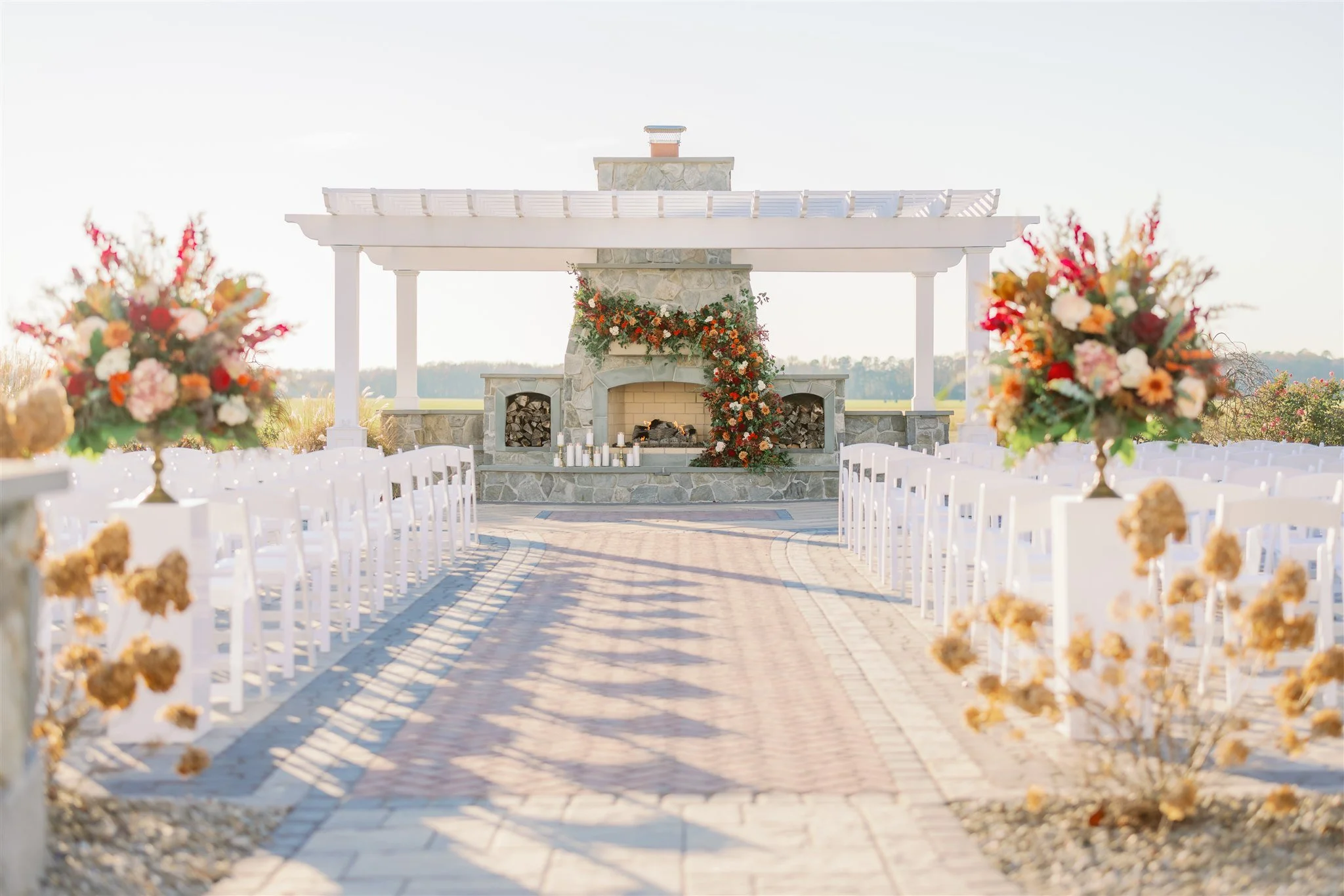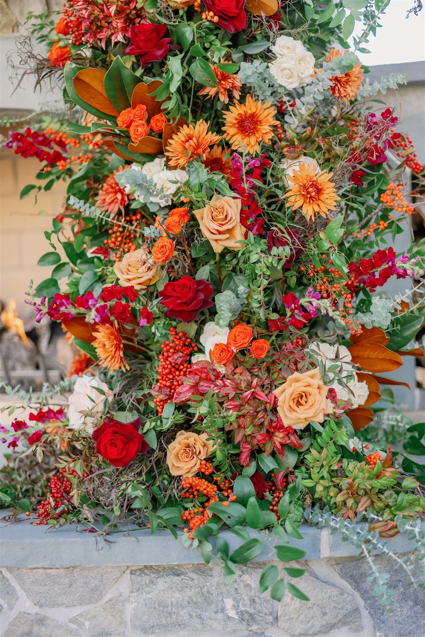 With a vibrant fall color palette and floral abundance throughout the venue, M & M’s November wedding at Vanderwende Acres is definitely a stand out for years to come! The ceiling of the reception pavilion was a particular area where the couple wanted a pop of color, and we came to the decision to add lush greenery and pops of bold blooms on all three of the large chandeliers in the space. There was color from floor to ceiling and this created an amazing visual experience throughout the reception!