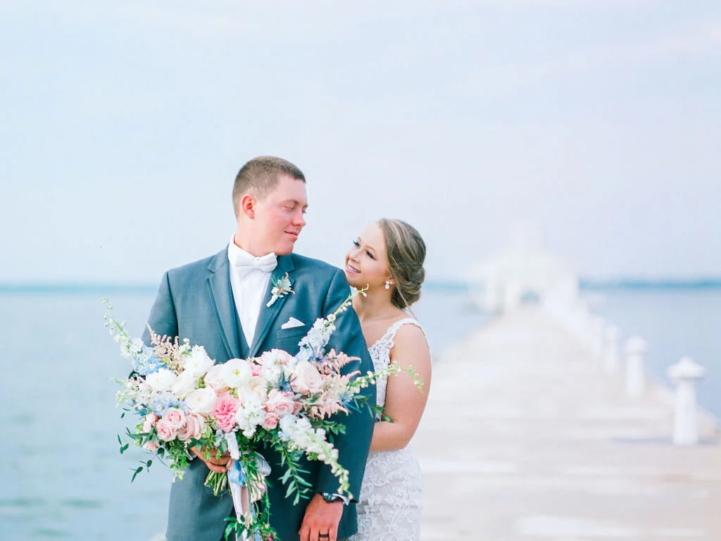 A blush and dusty blue palette was the epitome of spring romance for this May wedding at the Hyatt Regency Chesapeake Bay. The ceremony was held out on the Breakwater Pavilion, floating in the middle of the Choptank River, with over 80 feet of greenery garland accenting the ramp to the dock. Reception decor included low lush centerpieces of hydrangea roses, as well as elevated large designs on clear glass vases. While all of the elements were gorgeous, Brooke’s bouquet was by far the focal point of her floral designs, with a wide shape from baby blue delphinium, premium garden roses, and whimiscal vines.