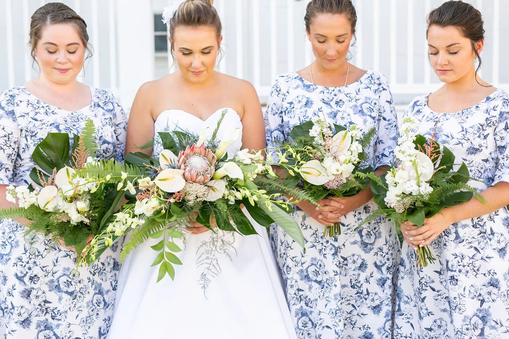 I don’t get to work with tropicals frequently, aside from the statement protea bloom that has become so popular, so when Olivia wanted to bring the feel of the Hawaiian Islands to Tilghman Island, I was thrilled! Their wedding had so many cool details that really spoke of their love story. Probably my favorite design from their wedding day was actually the smallest one - a mini pink pineapple boutonniere!! Also, I’m seriously in love with the blue floral bridesmaids gowns that added a vintage flair.